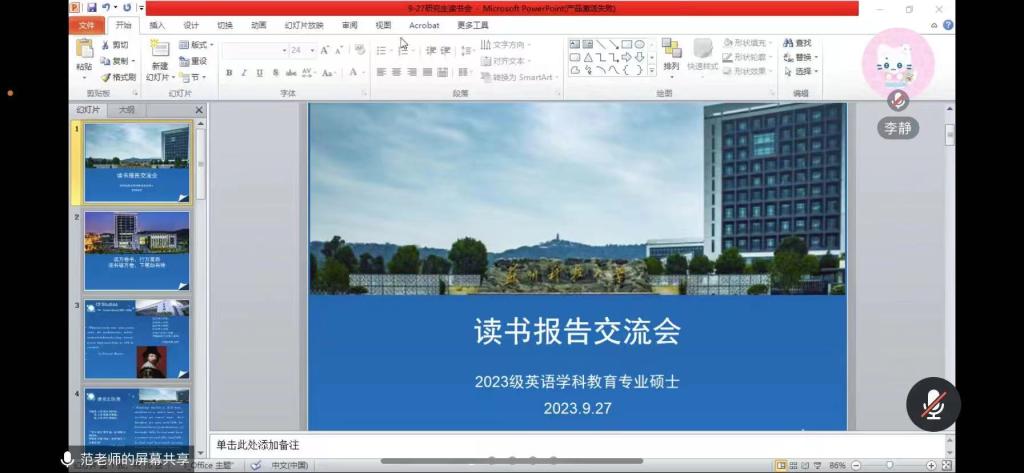 23级教育硕士第一次读书沙龙分享会顺利开展。本次分享会由范丽娟教授指导,共六名学生进行了读书分享,24名教育硕士全体参与。