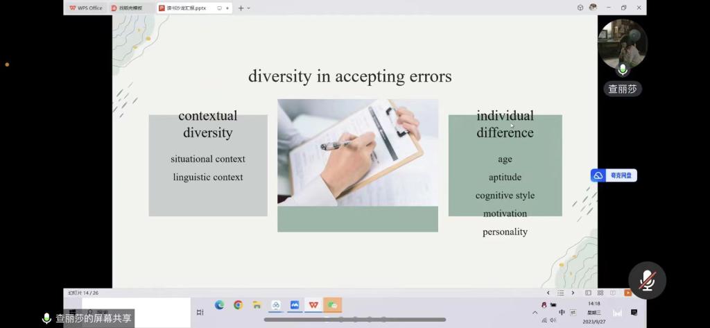 活动伊始,范丽娟教授对同学们进行阅读习惯的指导。“读万卷书,行万里路”,范教授认为阅读可以提升教师对教材本身的感知与思考,同时在信息发展的时代,同学们要利用各种网络资源进行读书和记笔记。随后六位同学依次进行读书汇报。陈宇昂分享的书籍是韩礼德的《语言与教育》,他详细地介绍本书的重点思想理论并作出自己的理解与反思。查丽莎分享的书籍是Understand Second Language Acquisition。该同学通过英文介绍本书的整体框架,简要阐述二语习得的定义、基本理论、习得方式以及影响等,并分享了自己对于二语习得的理解与感悟。王俊玮分享的书籍是《英语教学研究方法与案例分析》。他认为教师要具体分析研究主体,通过严谨的实验研究寻找更优的教学方法来提高学生成绩。程苏洋分享的书籍是《核心素养下的英语教学理念和实践》,她领悟到思维品质和英语学习之间的辩证关系以及核心素养对学生的重要意义。陈婷通过阅读What’s Whole in Whole Language,认识到教师要从自身做起、培养自身的全语言意识来带动学生的语言发展。祝天奕分享了《语言学简史》中的古希腊语言学发展史,从古希腊语言学的简介、两次冲突、外语和外文、影响四个维度向大家作报告。