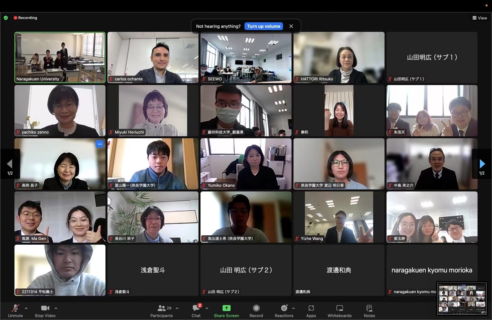 副院长(主持工作)綦亮及奈良学园大学社会与国际合作中心处长善野八千子分别致辞,日语系主任罗时光、副主任刘嘉勇及顾晶姝、秦莉等老师全程参与。
