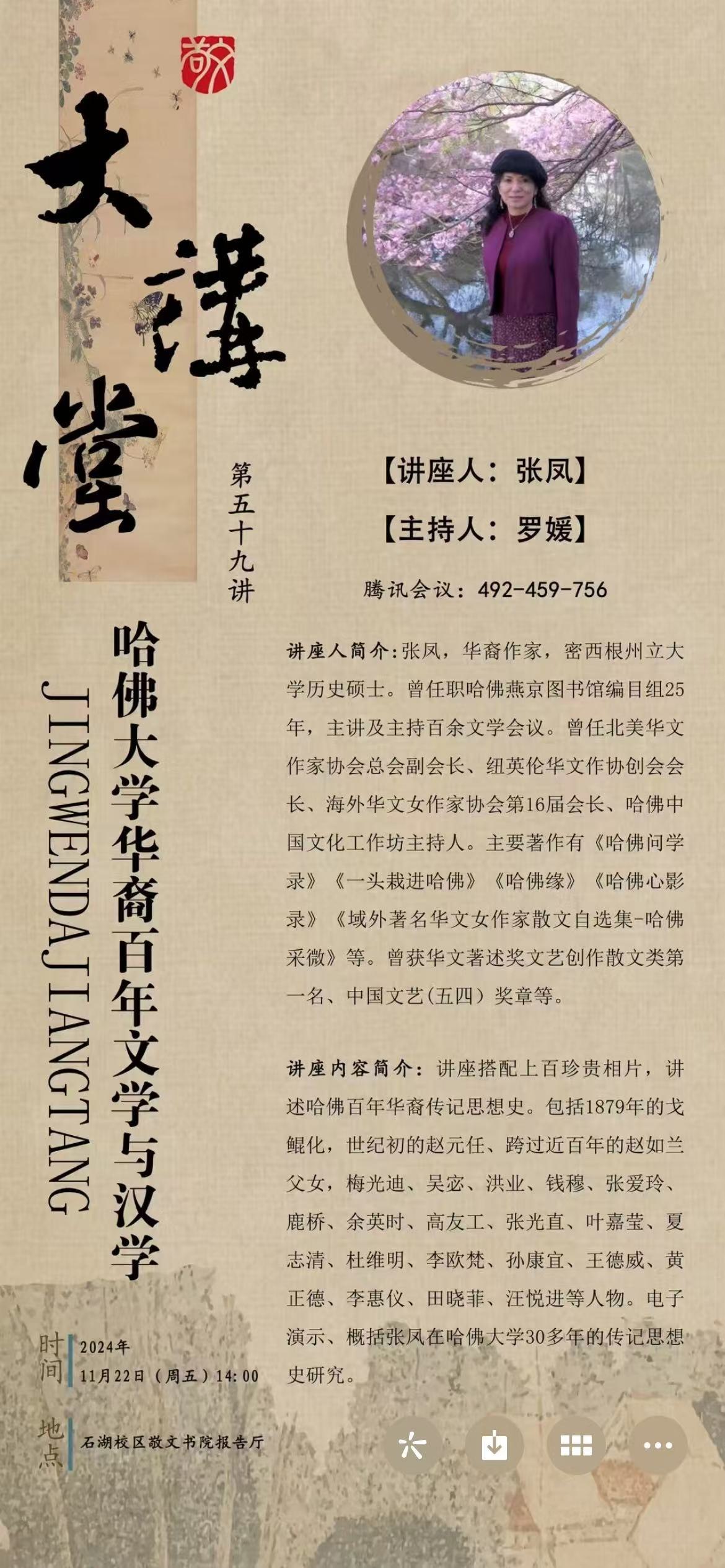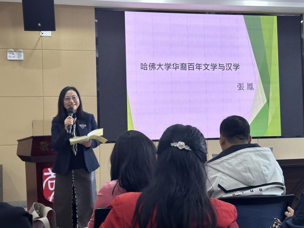 讲座上,张凤女士通过展示大量珍贵史料,梳理了哈佛大学百余年来华裔文学与汉学的发展历程。她追溯至1879年哈佛大学聘请戈鲲化开创中文教育,随后逐步建立哈佛燕京学社、汉和图书馆、东亚系及哈佛燕京图书馆,从而开启了中美文化交流的历史篇章。在这一过程中,诸多华裔知名学者如赵元任、洪业、杨联陞、张光直、李欧梵、叶嘉莹等,皆在哈佛传播汉学、弘扬中国文化,留下了深远影响。此外,张凤女士还分享了与赵如兰、杜维明、王德威、夏志清等著名华裔学者交往的点滴轶事,从由赵如兰教授和陆惠风教授创设的“剑桥新语社”到由李欧梵教授主持的“中国文化工作坊”、及王德威教授和张凤老师主持的“中国文化工作坊”,在代际传承的学术共同体中探讨华裔文学的发展脉络。她结合自身在写作中深入研究史料及与哈佛华裔学者对话三十年的经历,揭示了哈佛汉学研究的广阔空间,阐述了汉学在哈佛传播的起源与演变。整场讲座内容生动朴实,见解深刻,不仅体现了主讲人扎实的文献功底,更展现了百年来华裔学者在哈佛致力于传播汉学的治学精神和对中国文化深沉而庄严的热爱,发人深省。