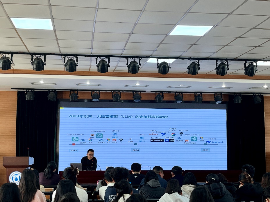 本次讲座内容包括AI大语言模型的发展历程,AI大语言模型当前在具体领域的应用情况和语言类学生如何利用AI自我赋能。首先,韩东博士向我们介绍LLM(大语言模型)的发展历程。他指出23年openAI的成功让各大科技公司开始投入大语言模型的开发,AI竞争愈加激烈。23年到24年,Chatgpt开始商业化,但离AGI这一概念走进现实仍是遥不可及。2024年开始,AI大厂投入研究降低推理/使用成本,优化客户应用和体验。随后,韩东博士介绍了AI目前在一些具体领域的应用情况,AI应用逻辑引擎使模型具有与业务专家相同的思维模式,打造数字员工和数字专家,实现基本降本增效。最后,韩东博士回答了在场师生的提问,指出当下应积极拥抱AI技术,学习使用发挥AI的长处,增加自身的就业竞争力。尤其对于语言类的学生,应兼顾AI的工具性和人文性,使其赋能于语言服务行业。