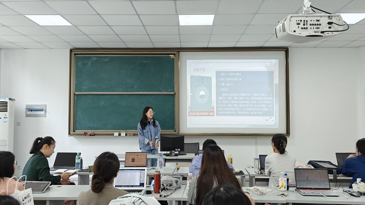 分享翻译实践的第三位同学是陈凯娇,她翻译的书目是走进中国古典园林丛书中的《留园》。该书富含园林建筑领域专业词汇、四字格词语,多引用诗句与文言文。为了解决语言转换中的难点,她借鉴黄忠廉的“变译”理论来指导自己的实践,采用增译、减译、编译、译述、缩译、并译、改译等手段来处理原文。接下来,她计划对留园进行实地走访,咨询导游以更好地完成该书的翻译。