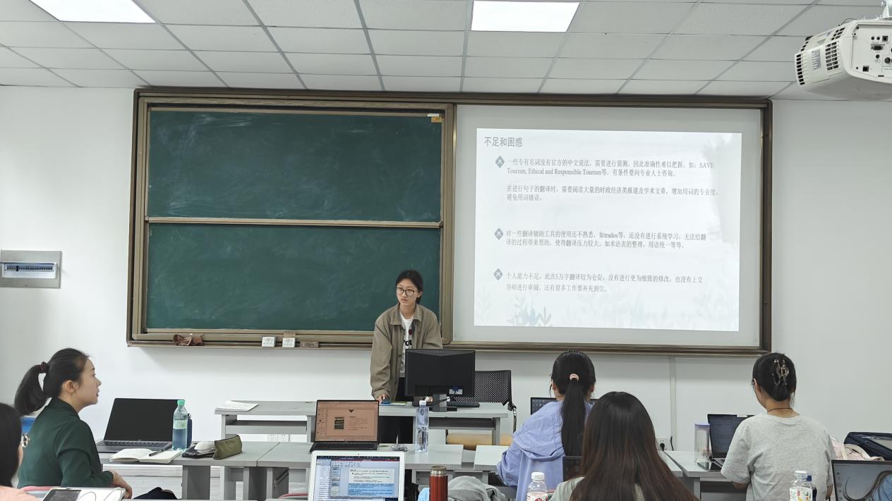 接着,陈彦潼同学对自己的翻译实践与体会进行了汇报,她翻译的书目是Ethical and Responsible Tourism Managing Sustainability in Local Tourism Destinations,中文译名为《道德与负责任旅游:地方旅游目的地的可持续性管理》。她选取彼得·纽马克语义翻译和交际翻译理论对其进行处理。她认为该书归属信息型文本,兼具呼唤型功能,因此在翻译时要以语义翻译理论为指导,结合专业词汇的特点,以源语为中心,通过合适的翻译方法和技巧准确地再现原文风格和词汇意义。同时还要追求译文通顺、地道,方能符合目的语语法规则和读者的语言习惯。