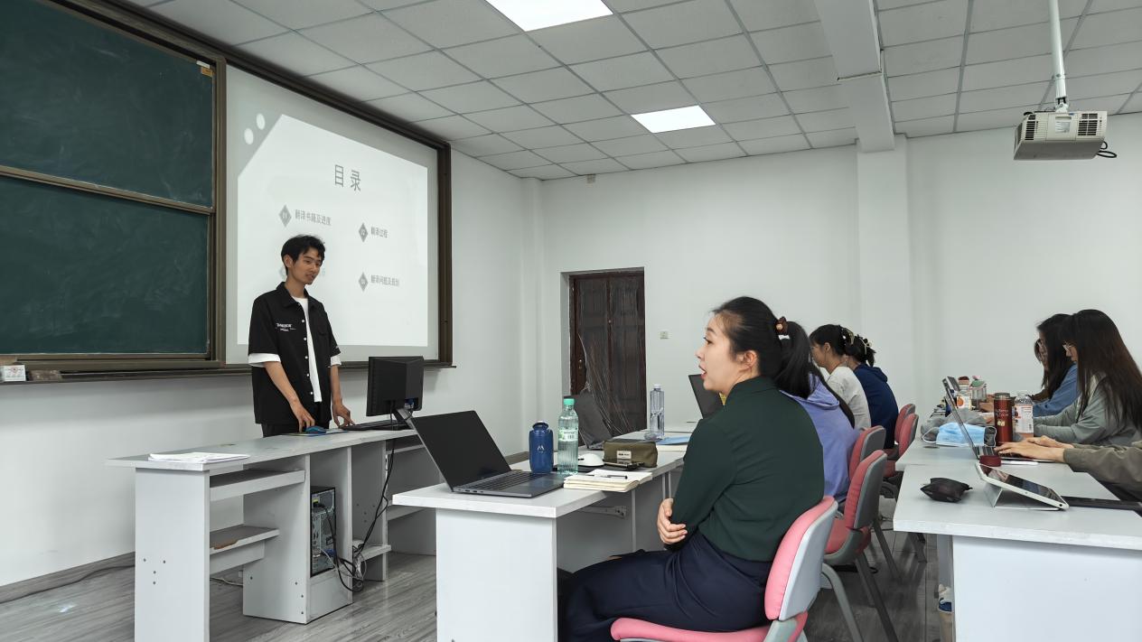 2023级翻译硕士班在教6楼418教室顺利举办首场翻译实践汇报会。本次汇报会邀请到翻硕导师郭雯博士莅临指导,共有5名学生对翻译中遇到的问题和解决办法进行逐个展示。15名翻译硕士全体参与。