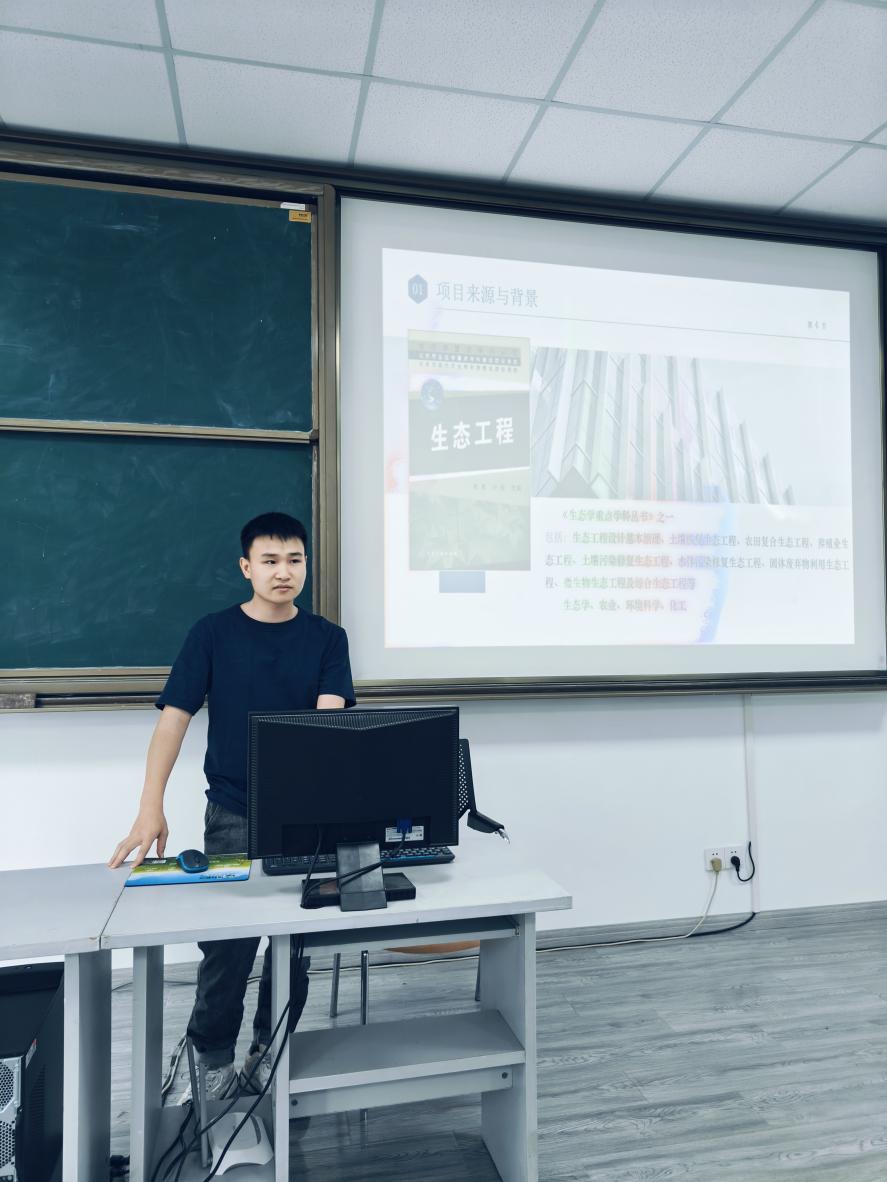 李竞硕同学首先汇报《生态工程》一书的翻译进展情况。他从项目概述、 翻译过程、待改进的问题等三个方面分享自己的翻译实践和心得,他指出,因为该书涉及生态学、农业、环境科学、化工等多个学科的知识,在跨语言转换上具有一定的挑战性。李竞硕同学针对书中难以处理的文本内容,积极寻求各种渠道来解决问题,在克服语言和技术问题之后,取得了一定的翻译效果,并打算在未来继续优化自己的翻译策略和方法。