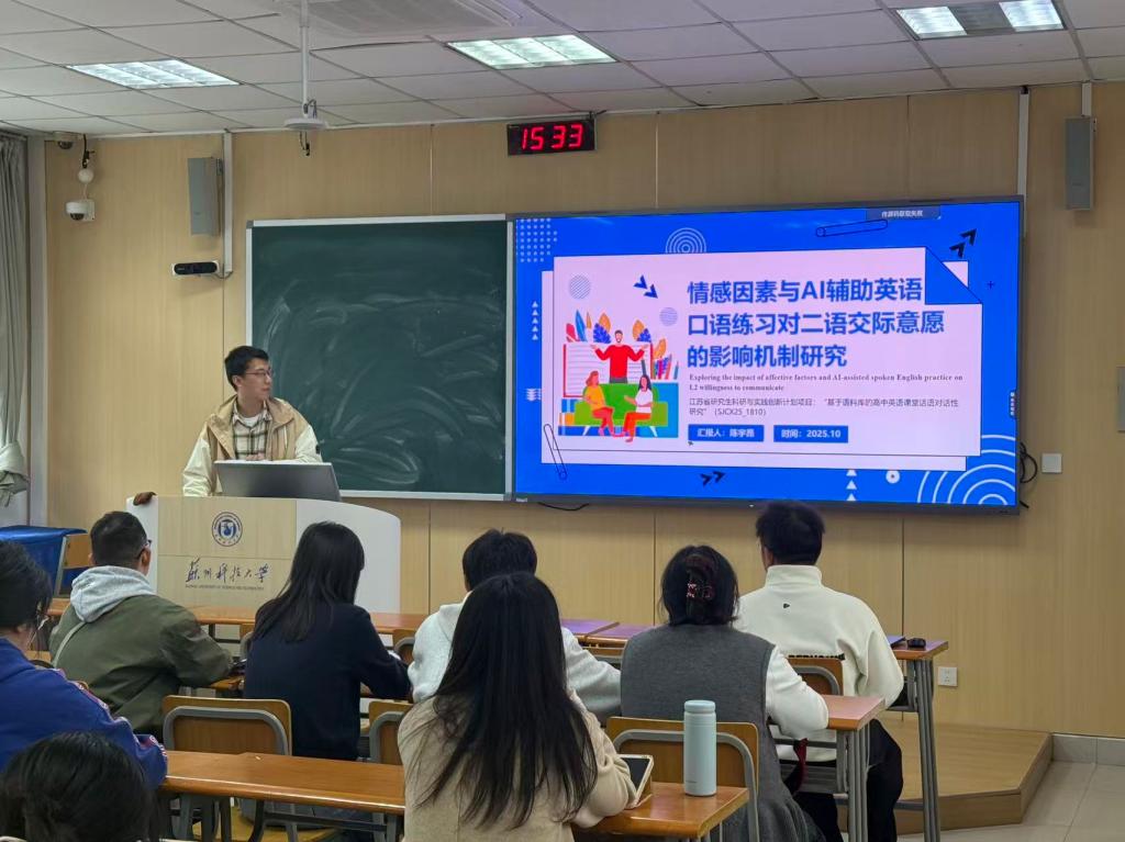 学科教学(英语)教育硕士举办本学期首次读书沙龙,2023级优秀研究生陈宇昂、王俊玮进行“读书助力科研”为主题的经验分享,张现荣老师现场指导。