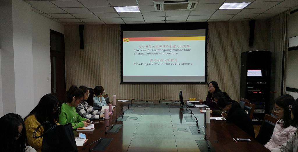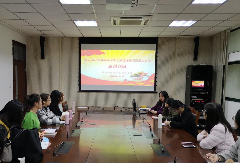 本次活动分为理论学习、专业学习和实践学习三部分。第一部分,支部书记周茹老师带领党员们通过一组图片了解了十九届五中全会的基本内容,学习了党的五中全会公报,并学习了第十四个五年规划和二〇三五年远景目标的建议。党员们认真聆听了周老师的讲解,随后每位党员依次对公报的14个关键词进行了解读。第二部分由周宇宁同学带领各位党员学习了党的十九届五中全会重点词汇英译版本。第三部分,周老师带领大家学习了各地青年学习贯彻落实五中全会精神情况。希望全体学生党员通过本次学习,对十九届五中全会的精神内涵有了更深刻的理解,并以更饱满的热情和更强的斗志,在新征程上谱写新时代的青春之歌。