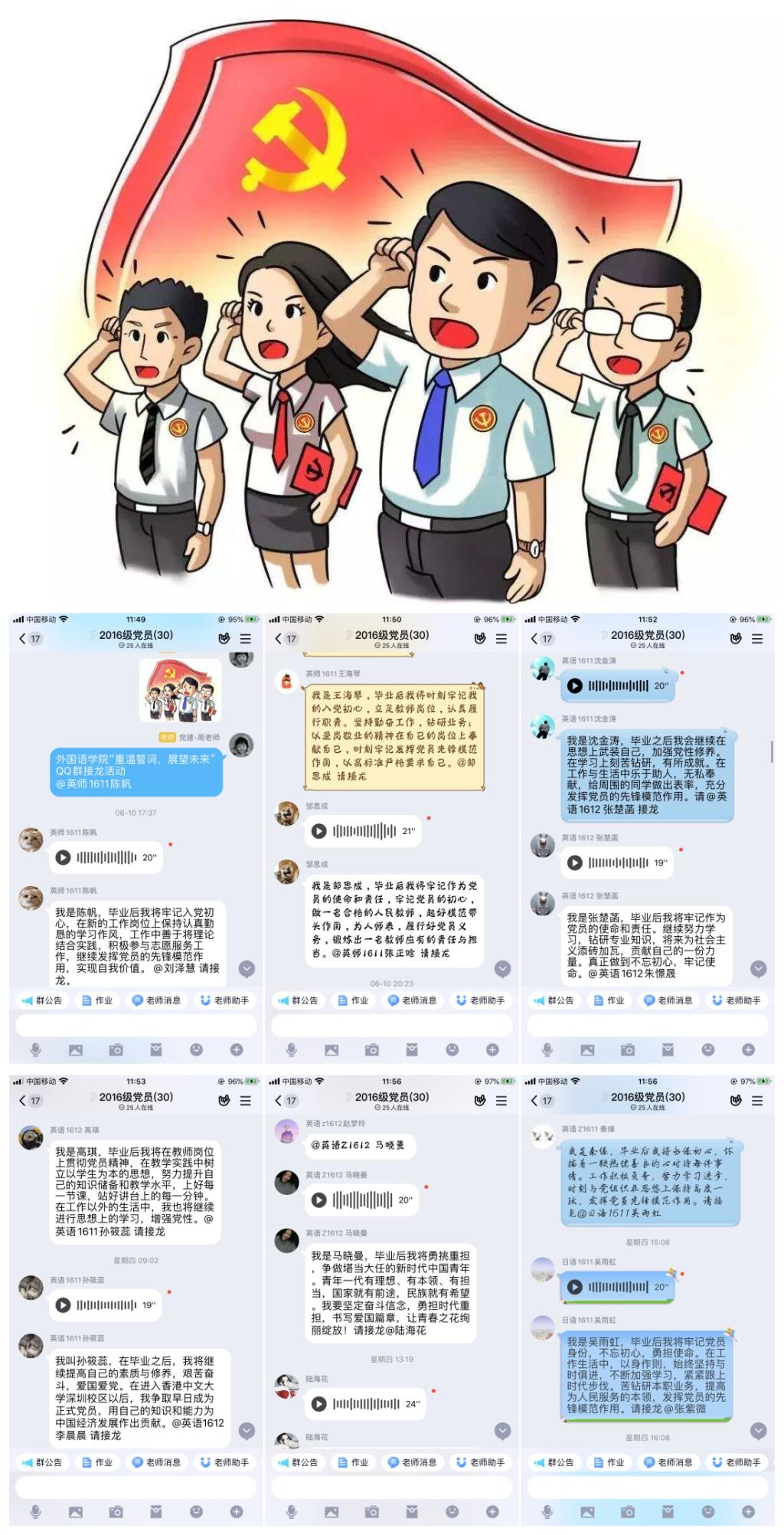 此次活动由周茹老师主持,从陈帆同学开始,将宣读誓词的语音和展望未来文字发布到QQ群内,全体党员依次进行接龙。党员们重温入党誓词,再次庄严宣誓要成为一名优秀的共产党员。整个活动中,全体党员同志还进一步展望未来,就毕业后如何牢记党员身份,如何在新的岗位上发挥党员的先锋模范作用进行了讨论发言。大家纷纷表示,毕业后,无论在何种岗位上,都一定不会松懈理论上的学习,一定会牢记入党誓言,进一步端正思想,坚定理想信念。党员们表示毕业后,一定会充分利用自己大学阶段学习到的专业知识和技能,为所处工作岗位添砖加瓦,同时以身作则,带动身边的人积极进取,发挥党员先锋模范作用,争做一名合格的新时代青年党员。