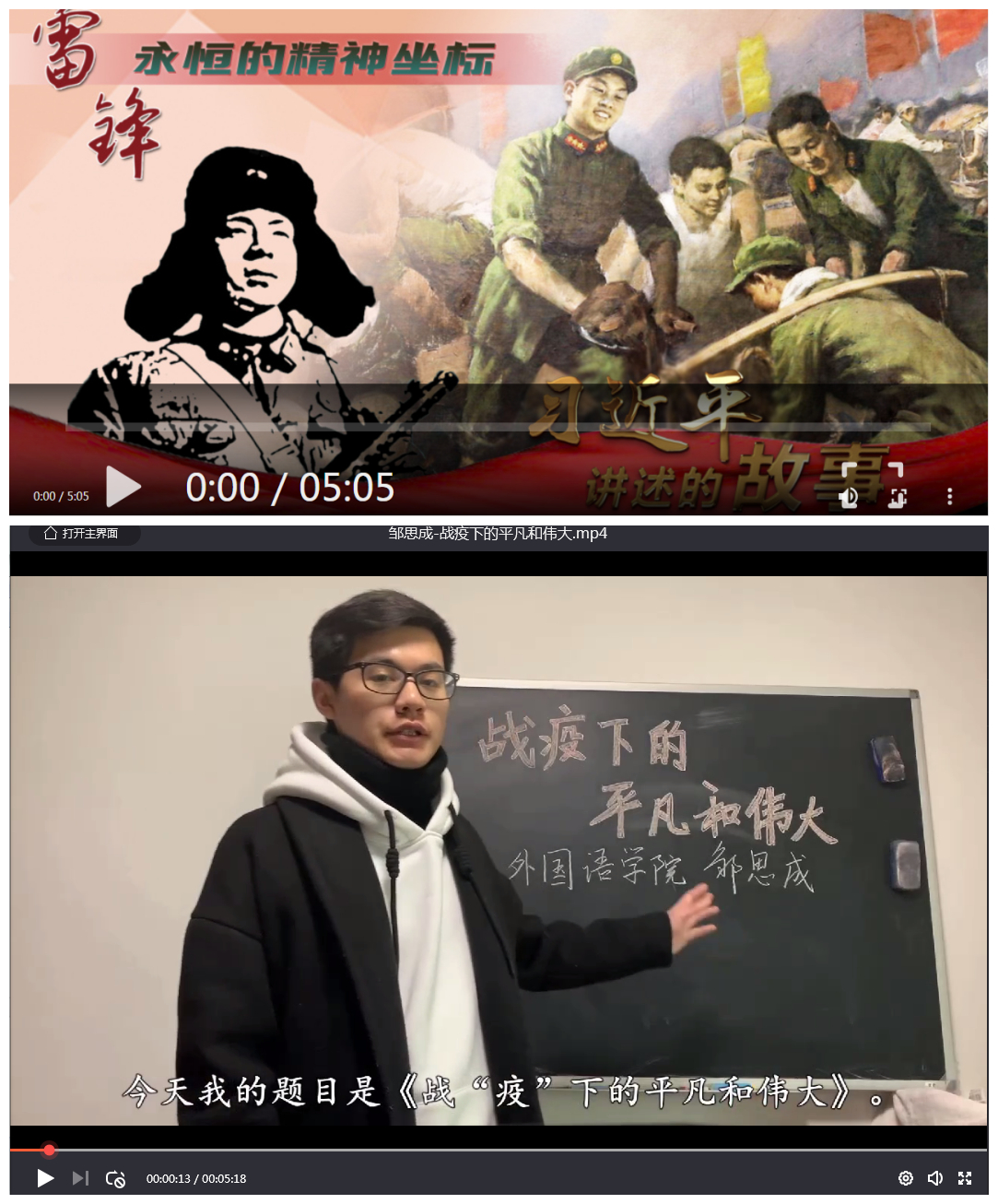 会议伊始,周老师首先以“学习强国”平台为依托,和大家分享了“雷锋,永恒的精神坐标”的雷锋故事,通过重温雷锋故事来感悟雷锋精神。然后周老师上传了由支部党员邹思成同学的微演讲《战疫下的平凡和伟大》,并和党员们一起聆听了他的演讲。邹思成以“战役下的平凡和伟大”为主题,用通俗但极具感染力的语言向大家介绍疫情期间为疫情防控工作作出不懈努力的新时代雷锋人。之后,周老师和大家一起阅读了习近平总书记关于雷锋日的讲话。讲话中习近平总书记指出,我们既要学习雷锋的精神,也要学习雷锋的做法,把崇高理想信念和道德品质追求转化为具体行动,体现在平凡的工作生活中,作出自己应有的贡献,把雷锋精神代代传承下去。党员们读了这段话后都深有感触,其中徐诗卉和徐紫薇两位党员以视频的形式和大家分享了她们的故事。徐诗卉同学讲述了自己父母在抗“疫”工作中的故事,徐紫薇同学则分享了她的护士朋友主动请缨支援武汉以及她自己参与社区防疫志愿工作的故事,党员们身边的故事让大家更加切实地体会到这场没有硝烟的战争下平凡的人们闪耀着的不平凡光芒。活动最后,学生英师支部全体党员围绕党日活动主题,结合党日活动的内容,用文字和照片的形式同大家分享了自己的感受。党员们坚信在雷锋人乃至全体中国人的努力下,这场疫情防控战终将迎来胜利。