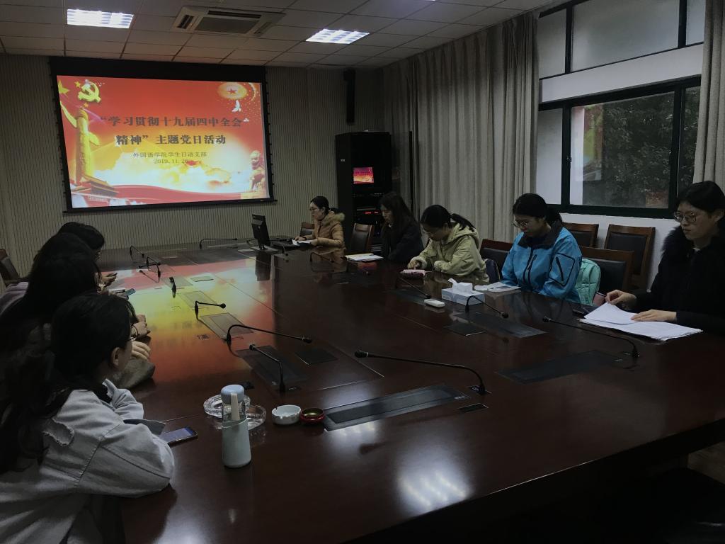 20191126日下午四点学生日语支部在C2-308开展“学习贯彻十九届四中全会精神”主题党日活动。本次会议由支部书记陈碧榭主持,学生日语支部11名党员参加,1名事假。