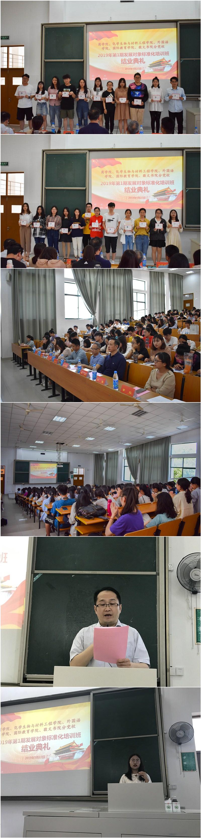 的季炜镓、国际教育学院的周婷怡和敬文书院的田甜作为优秀学员代表上台分享了他们的学习心得。五位优秀学员将自身实际与党员的义务结合起来,提出要在各方面起模范带头作用,不断提高自己的学习能力。在处理好学习和各个工作的关系的同时也要提高自己的思想境界,并同群众同甘共苦。通过此次培训班的学习,学员们深入了解了党史,学习了如何做一名合格党员,也认识到了当代青年大学生应该肩负起时代责任。在党的领导下,青年人应当练就过硬本领,为中华民族伟大复兴而不懈奋斗。同时,他们都将以今天的结业典礼为新的起点,把自己的追求与国家民族的命运紧密联结,通过自己的学习和不懈努力实现自己梦寐以求的理想。随后,国际教育学院党总支副书记刘强老师宣读优秀学员、结业学员名单。五个学院的领导老师为优秀学员颁发证书,并合影留念。最后,刘强老师作总结发言。他首先肯定了本次发展对象标准化培训班的成功开展,并对每位学员的认真与努力提出了表扬和鼓励。他还强调,党校结业是学习的另一个起点,希望同学们继续加强理论学习,树立终身学习观念,与时俱进地学习马克思主义,不断完善自己,进一步端正入党动机,要正确理解、主动接受组织的考察和考验。坚持学以致用,坚定人生信仰,实现人生精彩,以实际行动争取早日入党。