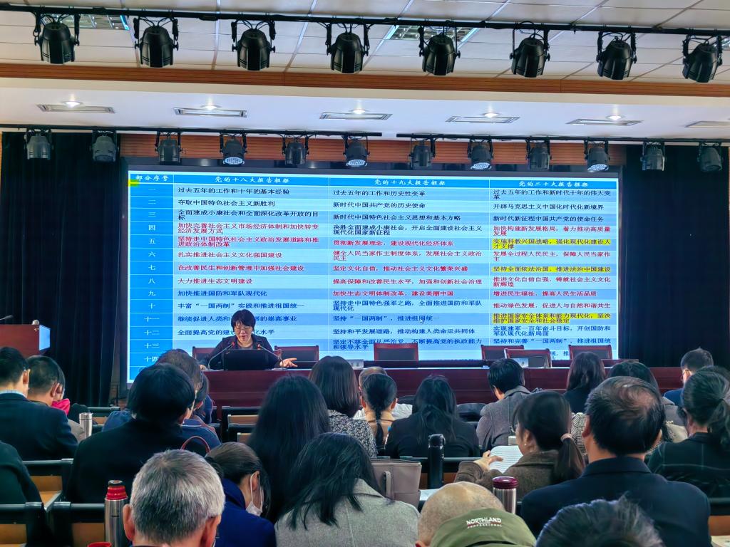 党委书记姚之彦主持,学院全体教职工及学生党员参加。朱蓉蓉以《全面推进中华民族伟大复兴的政治宣言和行动纲领--深入学习贯彻党的二十大精神》为题,从“踔厉奋发、迈向新征程,勇毅前行、擎画新蓝图,知行合一、勇担新使命”三方面,细致阐述了如何深入领会和贯彻党的二十大精神。在党的自我革命和全面从严治党方面做了重点辅导,全面讲授了党的二十大通过的《中国共产党章程》,特别对新党章修订的50处内容与2017年版党章做了详细对照讲解。朱教授的宣讲有利于学院师生进一步夯实党纪法规理论基础,筑牢廉洁思想防线。