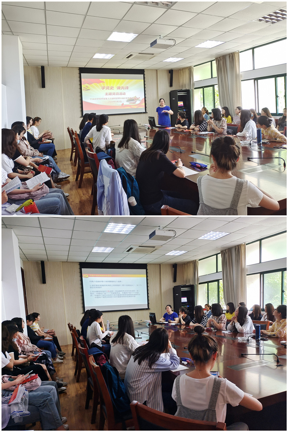 在C2-308会议室举行了“学党史、做先锋”毕业生党员组织纪律和组织关系专题教育主题党日活动,此次活动由党委副书记周茹老师主持,旨在帮助毕业生党员了解组织关系转接的相关要求和流程,增强党员的组织意识。