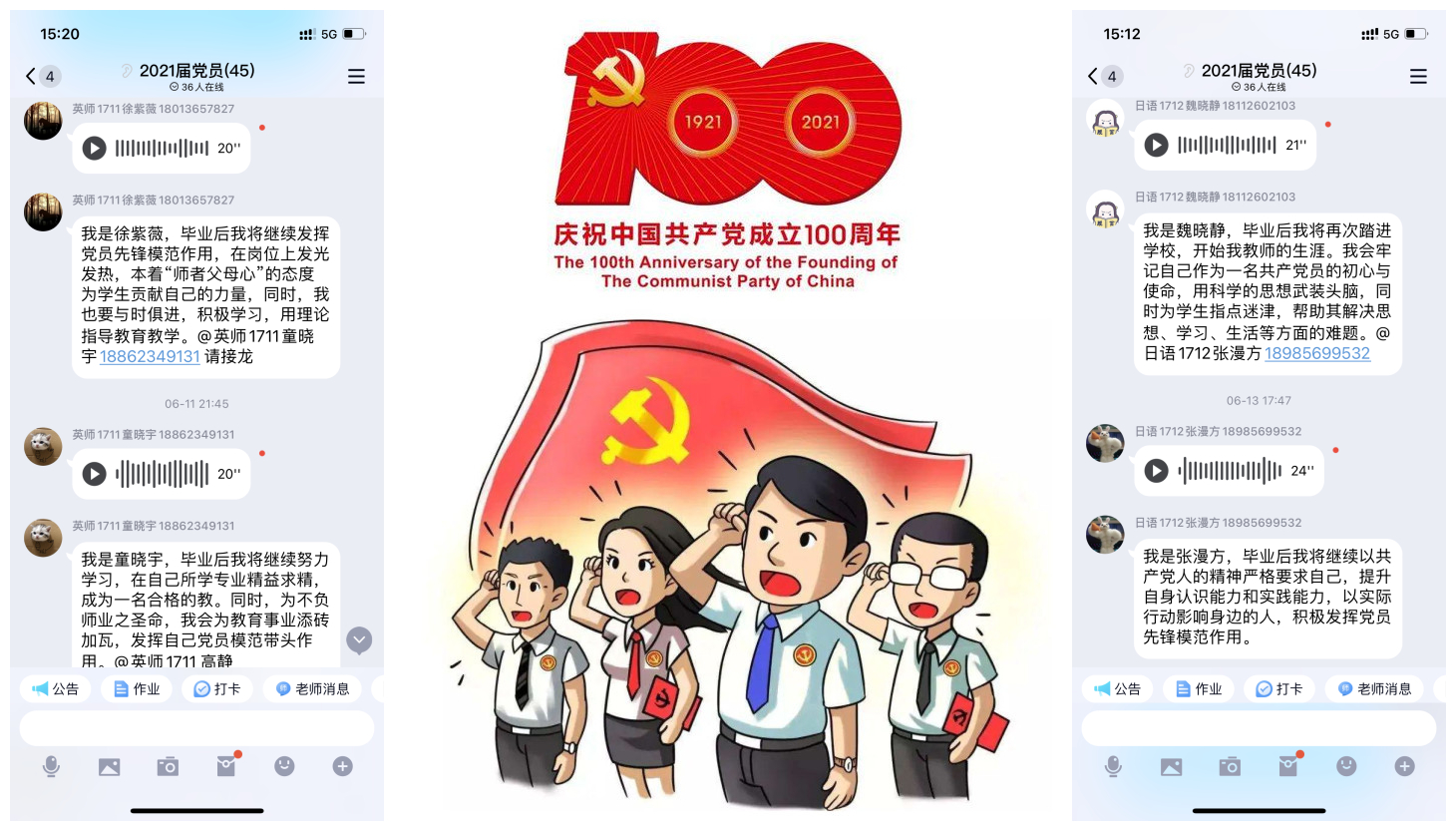 此次活动由周茹老师主持,从伍佩佩同学开始,将宣读誓词的语音和展望未来的文字发布到QQ群内,全体毕业生党员依次接龙。党员们重温入党誓词,再次庄严宣誓要成为一名优秀的共产党员。活动中,全体毕业生党员还进一步展望未来,就毕业后如何将个人理想融入到国家发展中,如何在新的岗位上发挥党员的先锋模范作用进行了讨论发言。大家纷纷表示,毕业后,无论在何种岗位上,都一定不会松懈理论学习,一定会牢记入党誓词,进一步端正思想,坚定理想信念。党员们表示,毕业后,一定会充分利用自己大学阶段学习到的专业知识和技能,为所处工作岗位添砖加瓦,同时以身作则,带动身边的人积极进取,发挥党员的先锋模范作用,争做一名合格的新时代青年党员。