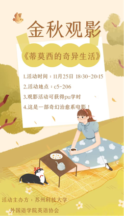 本次活动观看的是《蒂莫西的奇异生活》。观看完电影后,同学们收获了对生命意义的感悟。在同学们体味生命的真正意义的同时,此次观影活动也走到了尾声。影片结束后,活动组织者给到场的每一位同学发放了书签和便利贴作为小礼品。同时,英协的干事们还在第二天对参加观影的部分同学进行了采访,邀请他们用英语谈了自己的感受:应用自己的努力带给身边每一个人幸福,用自己的乐观面对一切的挫折和变故,——哪怕自己终会像落叶般归于尘土,生命的热烈和美好却不会因短暂改变。