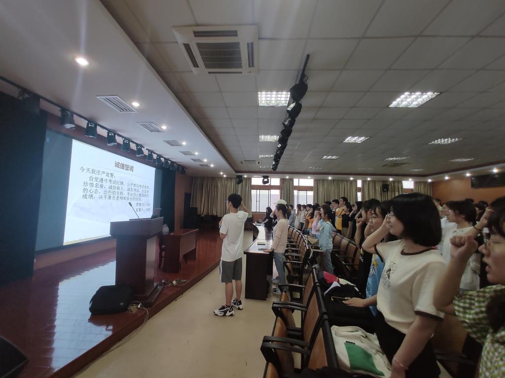 会议伊始,陈老师播放了诚信考试宣传片,并集中学习了2020年《学生手册》考试相关的条例和规定,然后通过学校出现的真实案例给学生们开展了警示教育。最后,陈老师带领2018级全体学生进行了诚信宣誓仪式并要求全体同学手抄《诚信考试承诺书》。