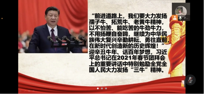 33个班级通过线上会议形式召开本期主题班会。活动紧紧围绕深刻认识三牛精神”、发扬“三牛”精神展开,深入学习习近平总书记相关重要讲话精神。全体学生内化总书记亲自倡导的“中国牛”精神,以不怕苦、能吃苦的牛劲牛力,为中华民族伟大复兴倾心耕耘,以更加昂扬的精神状态和奋斗姿态干出牛气冲天的2021。