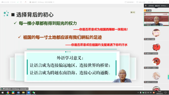 讲座中,王建新以“新时代外语人的理想信念与时代担当”为题,通过三组鲜活的边疆支教实践展开讲述。当“口粮教师的行囊”里倒出泛黄的教案本,当“风沙中的白杨”照片定格支教者坚守的身影,当“糖包子的甘甜”故事揭开文化交融的温暖,屏幕前的同学无不屏息凝神。在阐释“种子教师培养计划”时,王老师着重阐释了“工作坊+示范课+管理参与”的三维赋能模式:通过双语教案设计工作坊提升专业素养,借助沉浸式课堂示范促进教法革新,运用管理建言机制推动学校转型。互动环节将气氛推向高潮,针对学生提出的“如何实现从适应者到引领者转变”及“新时代教师核心适应力”之问,王建新以戈壁红柳分泌糖分构建共生生态作喻,强调“教育智慧藏在文化褶皱里,贵在发现的眼睛”,在其援疆随想《江城子·赴克州》“羌笛新声,吹彻水云乡”的诗韵中引发深刻共鸣。