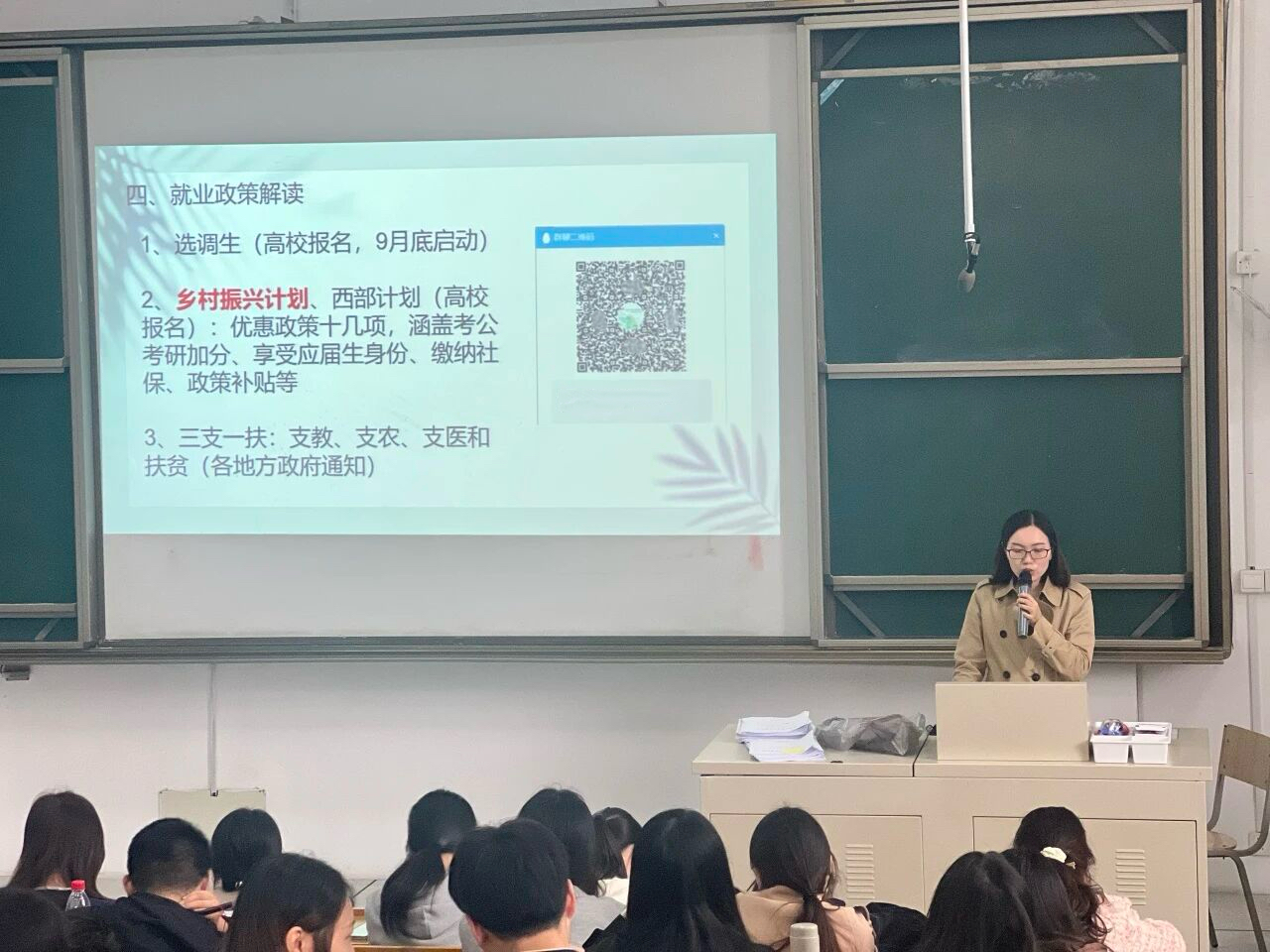 讲座中,辅导员陈老师深入分析了当前外语类毕业生的就业形势与市场特点,结合英语师范与商务英语两类培养方向,分别就中小学校、教育机构、外贸企业、跨境电商、翻译服务等多种就业渠道进行了详细介绍。重点讲解了求职简历制作要点、面试常见问题与应对技巧、就业信息搜集与筛选方法,以及就业协议书签订、档案转接等重要流程的注意事项。此外针对大四上学期,一些重要的招聘会安排,选调生、乡村振兴计划和西部计划等国家政策进行了讲解。