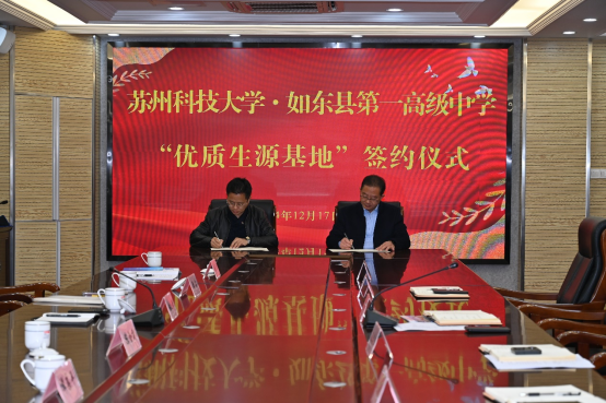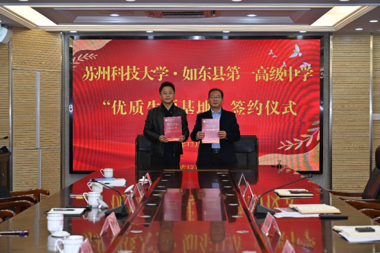 吴军对我校到访人员表示热烈欢迎,对我校选择如东县第一高级中学作为“优质生源基地”表示真挚感谢。他介绍了如东县第一高级中学的办学特点、生源质量、师资力量等情况,并表示期望以此次合作为契机,共创发展机遇,实现互惠双赢,搭建新的桥梁,带动高校与中学共同发展。姚之彦介绍了我校的办学历史、专业与学科特色、师资力量、人才培养等情况,对如东县第一高级中学向我校输送优质生源表示感谢,希望双方进一步加强合作,共促发展;凌飞介绍了我校本科生招生政策和在南通的招生情况。随后,双方共同观看了苏州科技大学宣传片。活动最后,双方代表签署了《关于建立“苏州科技大学优质生源基地”的合作协议》,并举行了优质生源基地授牌仪式。