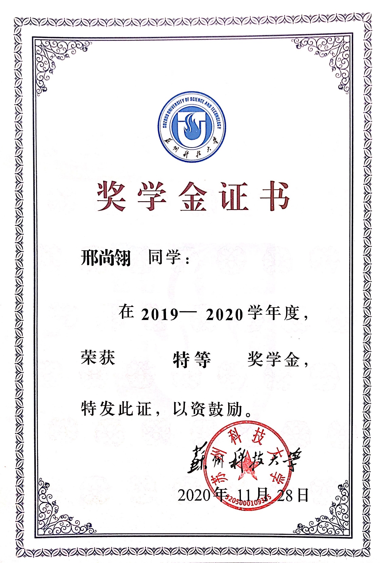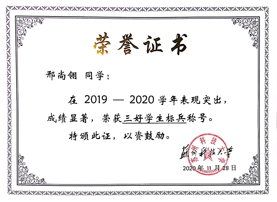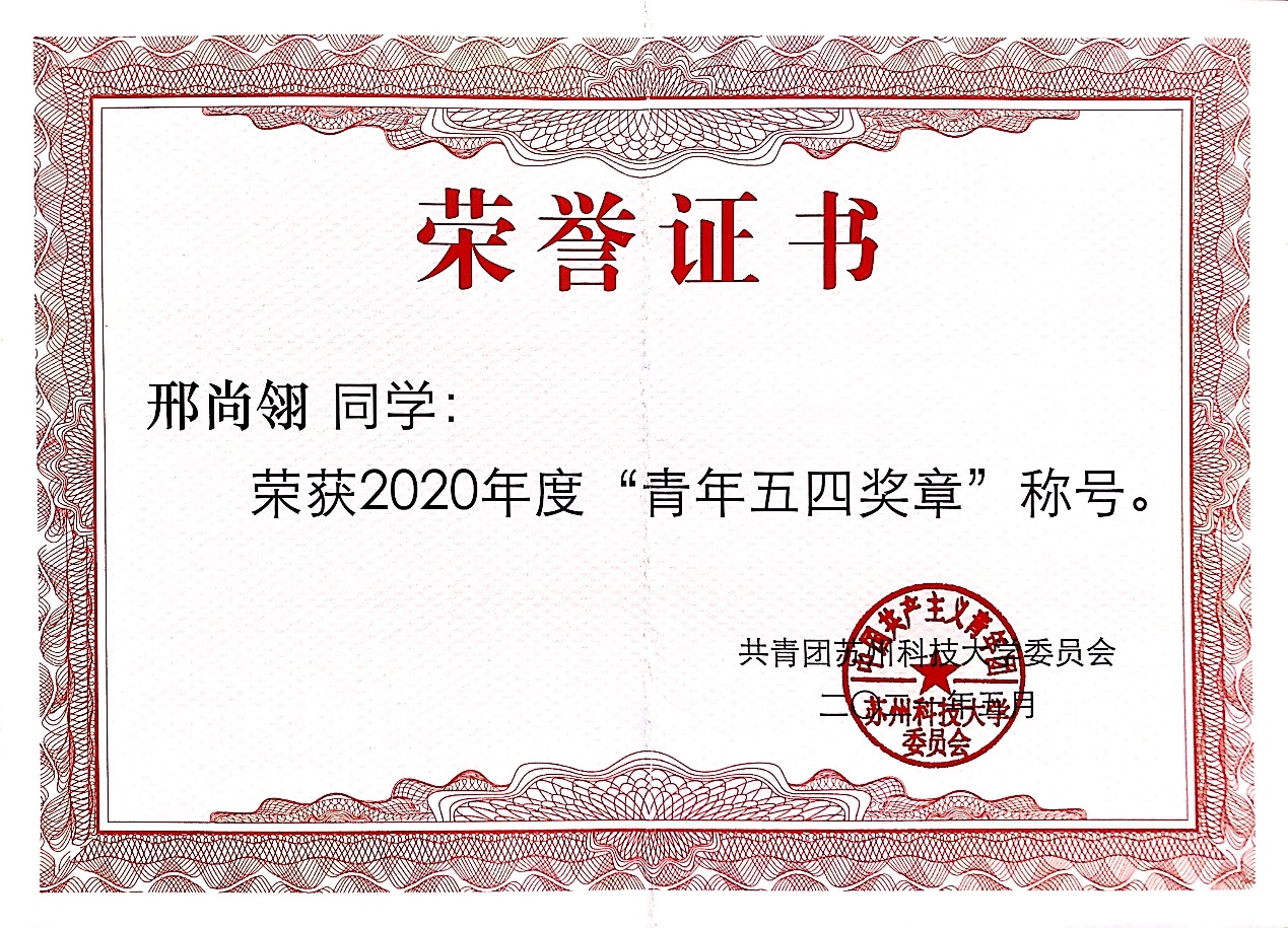 获校“综合特等奖学金”、校“综合一等奖学金”、英孚教育奖学金、江苏省“省级三好学生”、长三角高校书院联盟党史故事联讲竞赛一等奖、长三角高校书院联盟红色定向积分赛二等奖、江苏省大中专学生暑期“三下乡”社会实践活动“优秀团队”(队长)、江苏省青少年高校组“优秀模拟政协提案作品”、校“青年五四奖章”、校优秀学生干部(标兵)、校三好学生(标兵)、校优秀团干部、校优秀团员、校优秀志愿者、校社会工作奖、校文体活动奖、校社会实践“十佳团队”、校“优秀调研报告”、校社会实践“先进个人”、中国啦啦操俱乐部联赛第一名、江苏省全民运动会啦啦操一等奖、江苏省大学生艺术舞蹈展演三等奖、苏州市第十五届运动会啦啦操第一名、“壮丽70年,奋斗新时代”苏州高校舞蹈展演优秀剧目奖、校第十九届及二十一届运动会啦啦操比赛第一名、校第二届新星才艺大赛一等奖、校“学信杯”模拟面试大赛二等奖、校党团知识竞赛三等奖、敬文书院新生辩论赛亚军、江苏省第二十六届高校“校长杯”乒乓球比赛校级优秀志愿者、校“学党史、强信念、跟党走”师生大合唱校级优秀志愿者、校园文化精品培育名录库之“携手,伴夕”项目优秀志愿者。