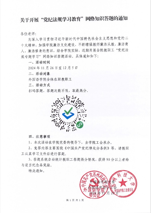 于 11 月 26 日至 12 月 5 日组织全院教职工开展了“党纪法规专题学习”网络知识答题活动。