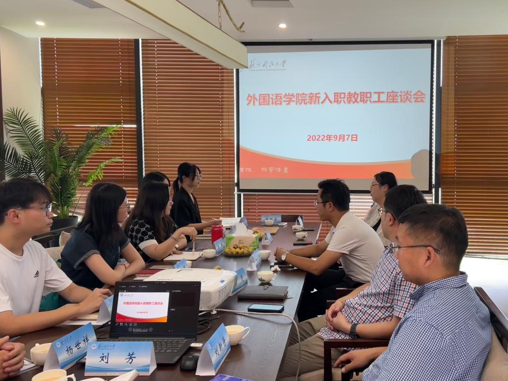 英语系教授祝平老师对新入职的老师表示欢迎,嘱咐新入职的辅导员要兼顾教师和研究者的双重身份,“两条腿”走路,既要站稳讲台,也要踏实做好科研。