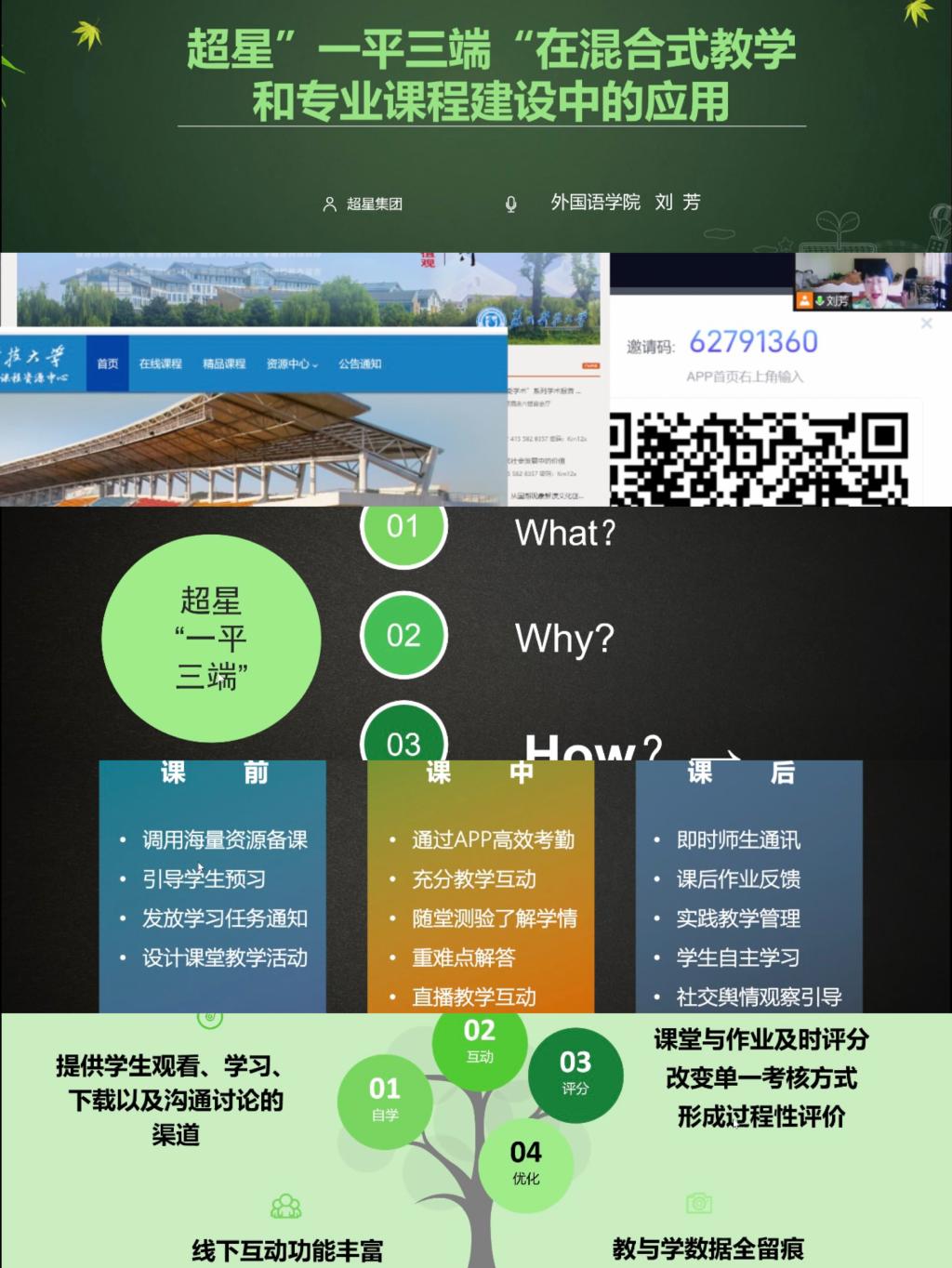 分工会邀请大外部刘芳老师给全院教师开展了一次题为“超星学习通一平三端在混合式教学及专业课程建设中的应用”讲座。全院教师积极参与,认真学习。