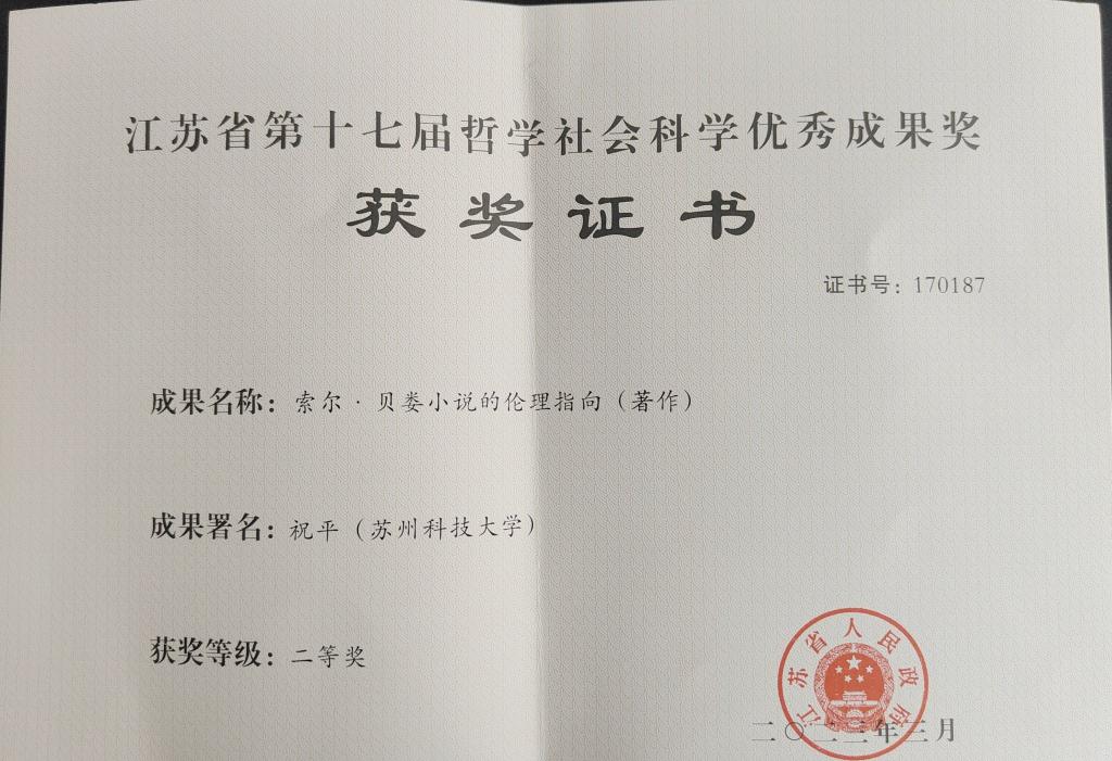 日前,江苏省人民政府公布了江苏省第十七届哲学社会科学优秀成果奖获奖名单。雷速体育 祝平教授的著作《索尔·贝娄小说的伦理指向》获二等奖;柯英教授的《苏珊・桑塔格:大西洋两侧最智慧的人》,作为普及成果《女性天才·生命、思想与言词系列》 (共八册) 之一,获二等奖;郭雯副教授的著作《克隆人科幻小说的文学伦理学批评研究》获三等奖。本次获奖,充分展示了雷速体育 外国文学研究团队的整体实力,为雷速体育 学科建设提供了有力支撑。