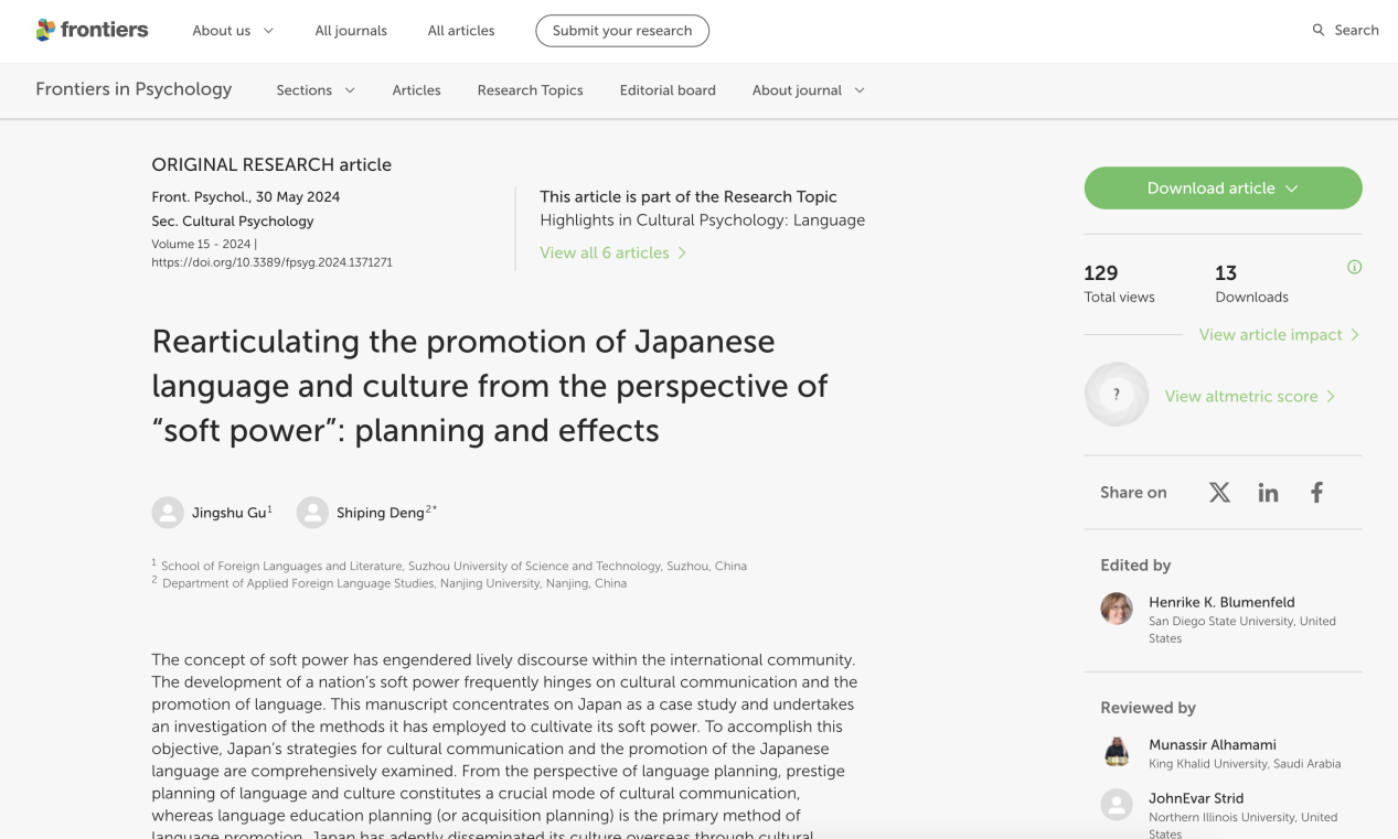 日语系顾晶姝博士以第一作者在SSCI一区期刊《Frontiers in Psychology》发表研究论文《Rearticulating the promotion of Japanese language and culture from the perspective of “soft power”: planning and effects》,第二作者(通讯作者)为南京大学邓世平博士。