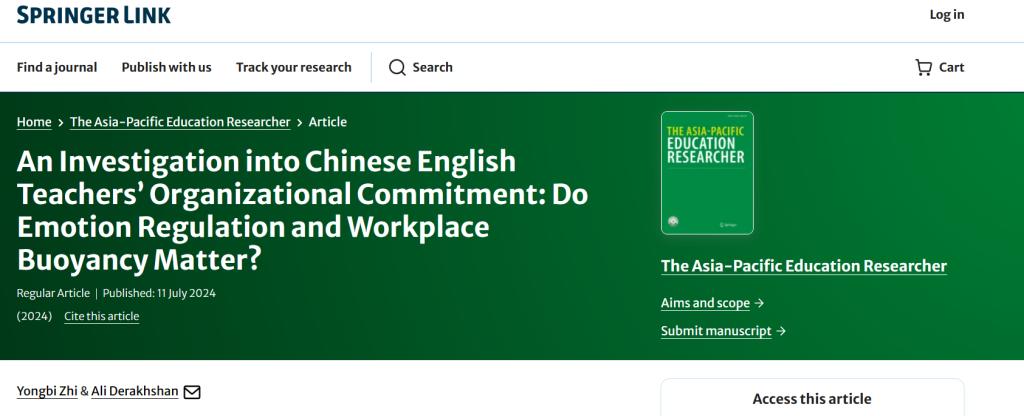 支永碧教授在国际权威期刊The Asia-Pacific Education Researcher(SSCI索引一区)发表了题为“An Investigation into Chinese English Teachers’ Organizational Commitment: Do Emotion Regulation and Workplace Buoyancy Matter?”的学术论文。支永碧教授为论文的第一作者,第二作者(通讯作者)为伊朗著名学者Ali Derakhshan教授。The Asia-Pacific Education Researcher 是一本SSCI索引期刊,归属于JCR教育与教育研究类别一区,影响因子为3.6。该期刊致力于发表涵盖教育理论、教学实践和政策研究的广泛主题,具有显著的学术影响力。该论文聚焦于中国英语教师的组织能力研究,首次探讨了情绪调节和工作韧性这两个情感属性对教师组织能力的促进作用。通过对270位中国英语教师的问卷数据进行验证性因子分析(CFA)和线性回归分析(LRA),研究发现情绪调节和工作韧性有助于显著提升(英语)教师的组织能力、职业表现和教学水平。该研究对教育管理者和广大一线教师具有重要的参考价值。