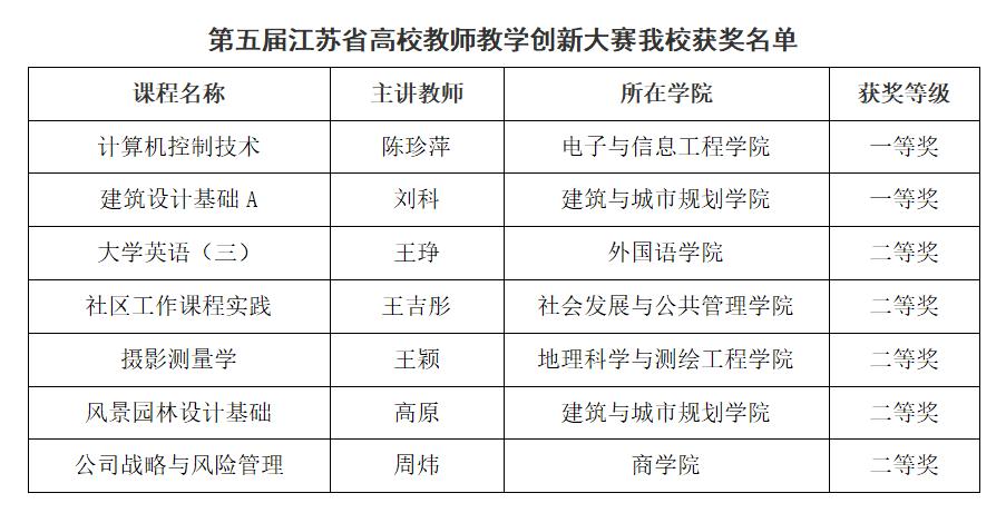 近日,江苏省高等教育学会正式公布了第五届江苏省高校教师教学创新大赛的获奖名单,我校在此次大赛中表现卓越,荣获一等奖 2 项、二等奖 5 项,并且被授予 “优秀组织奖”,充分彰显了我校在教学创新领域的强大实力与突出贡献。