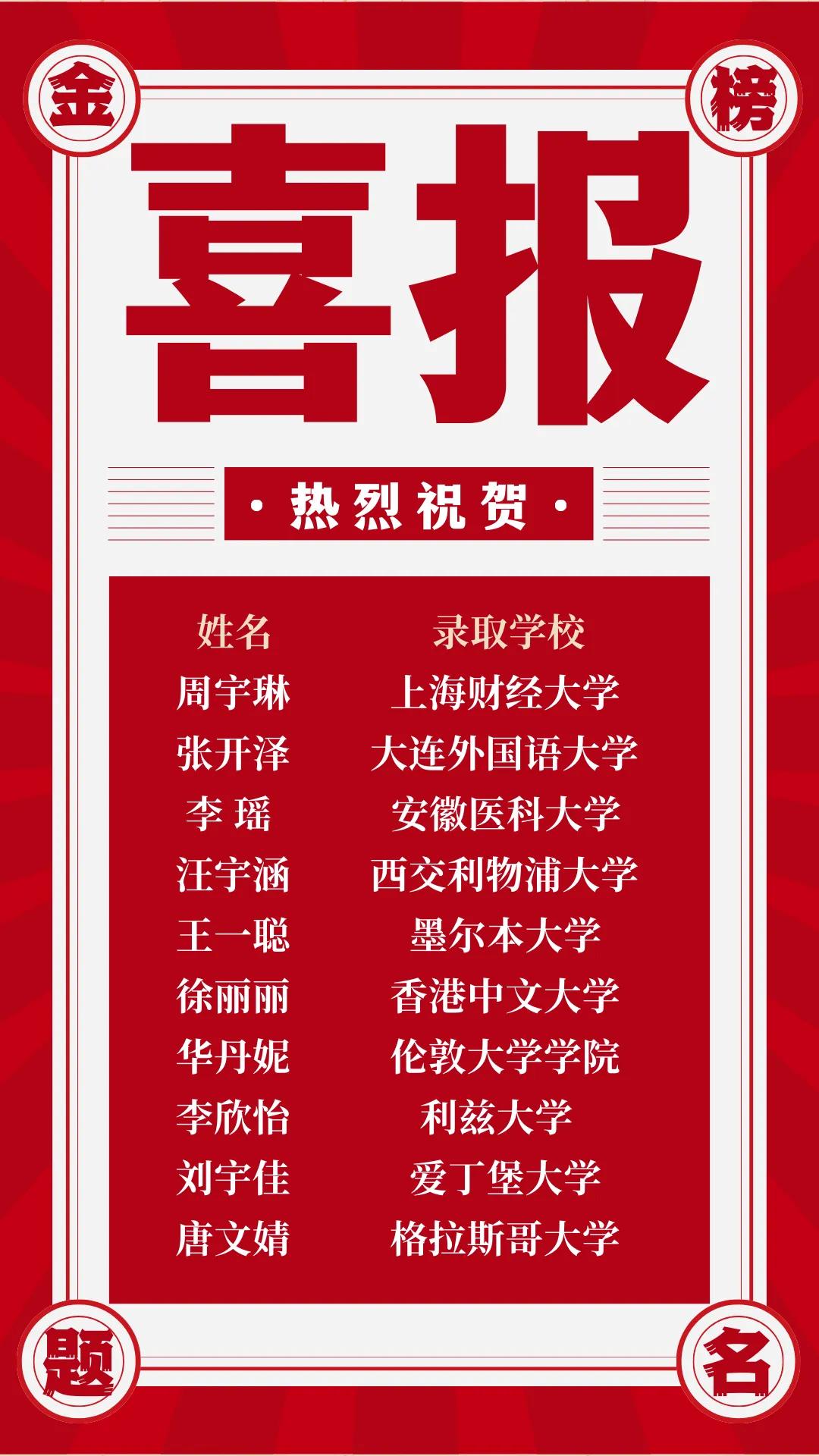 截至目前为止,雷速体育 2024届本科毕业生国(境)内、外升学共计41人。录取院校分别为北京大学、南京大学、香港中文大学、上海外国语大学、上海财经大学、南京航空航天大学、伦敦大学学院、悉尼大学等知名院校。