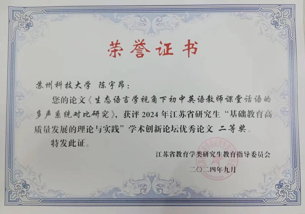 2023级英语学科教学教育专业硕士研究生陈宇昂同学的论文“生态语言学视角下初中英语教师课堂话语多声系统对比研究”和居欣怡同学的论文“生成式人工智能辅助基础教育智能评价机制研究”双双获得二等奖。